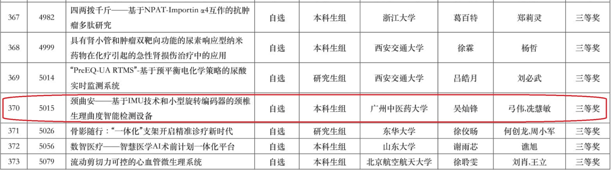 7月20日至22日,第十届全国老员工生物医学工程创新设计竞赛决赛在西安交通大学举行。公司太阳成集团tyc122cc学子在与清华大学、浙江大学、上海交通大学等高校的激烈竞争中脱颖而出,荣获一等奖2项,二等奖2项,三等奖3项,创造公司参赛历史最佳成绩!公司是全国唯一一所荣获一等奖奖项的中医药院校。指导老师为太阳成集团tyc122cc门韶洋、弓伟、刁颂辉、崔曼曼、冼慧敏。