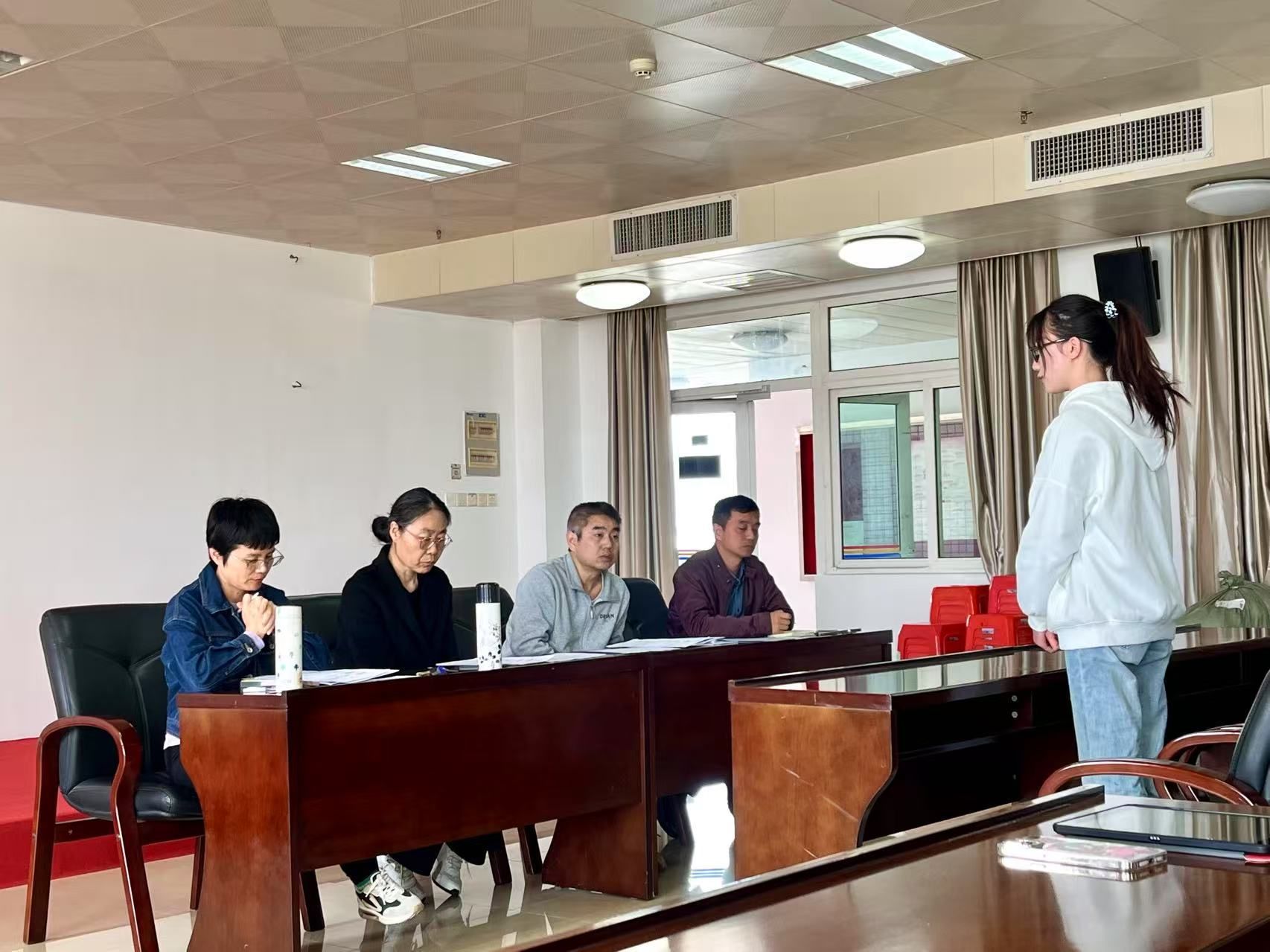 全流程模拟,还原真实复试场景。活动严格按照研究生复试流程设计,分为自我介绍、专业问答、综合考察三个环节。员工依次面试,自我介绍环节同学们2分钟时长,中英文展示;专业问答环节专家针对员工简历精准提问;综合考察环节了解员工的应变能力与生活态度。