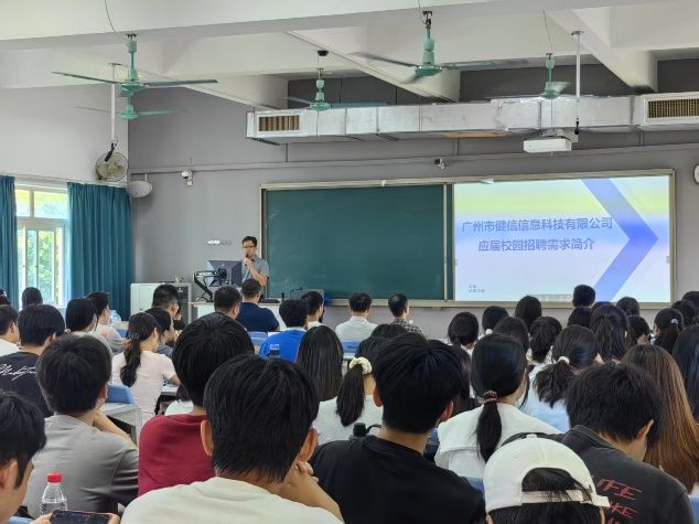 活动伊始,由各家企业进行集中宣讲。广州市健信信息科技有限公司、广州医博信息技术有限公司、广州智云信息技术有限公司以及广州超星信息技术有限公司的代表依次上台,简洁而精准地介绍各自的企业概况、业务范畴、岗位需求以及福利待遇等关键信息。台下同学们全神贯注,现场氛围专注且热烈,大家积极捕捉着每一个与未来职业相关的关键细节,为随后的面试环节做好充分准备。